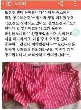 EXO的成员D.O出道初期,一网站公开贩卖其贴身内裤,并表示“这是我在他们宿舍亲自拿过来的,可以拿去做检查”,并且预告几天后将再度前往宿舍,偷取吴世勋的内裤。