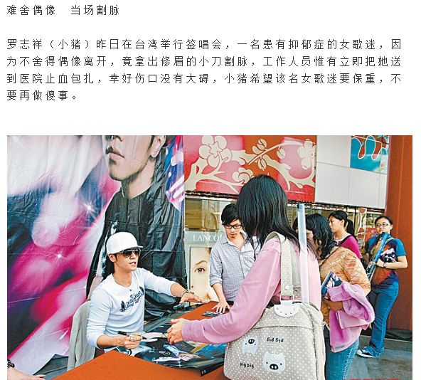 罗志祥在台湾高雄做签唱会时,台下有个兴奋异常的女歌迷,为了表忠心突然割腕自杀。万幸的是,歌迷被及时救下,而罗志祥也吓得不轻,连连劝歌迷们要珍惜生命,不要做出这样极端的举动来。