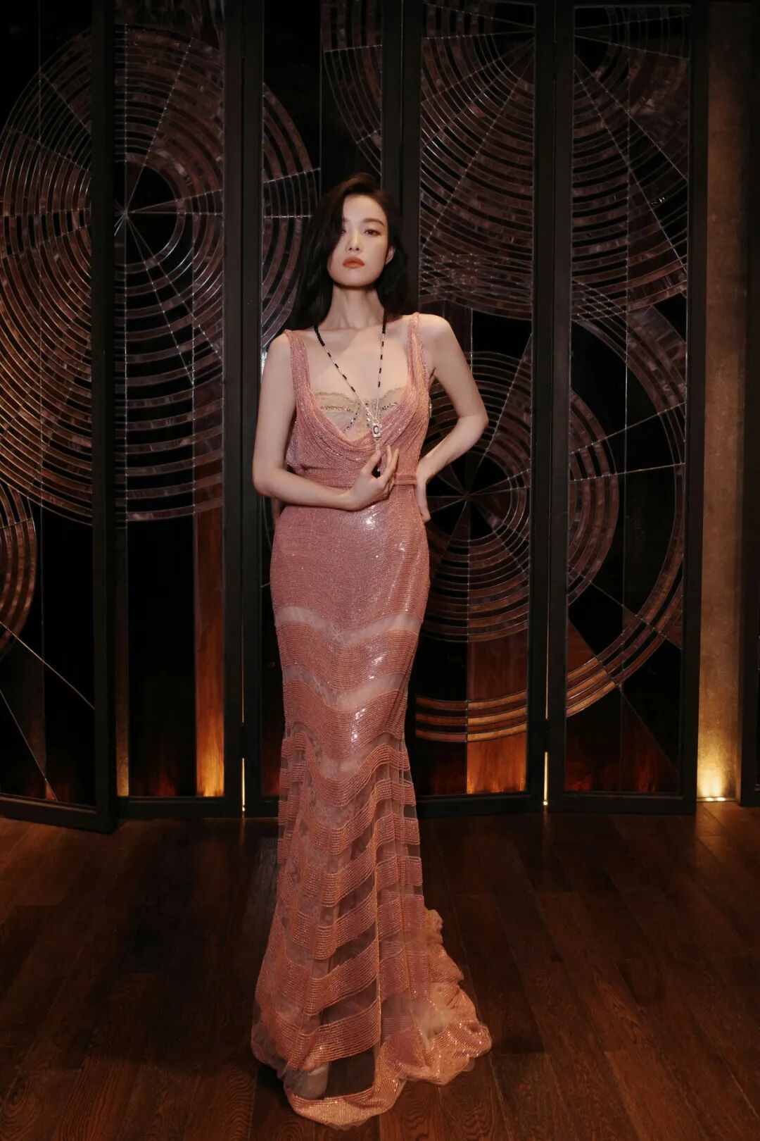 一袭粉色修身长裙,让夜色中的倪妮宛如身披星光的人鱼,明丽性感,惊艳了黄浦江畔的上海滩。