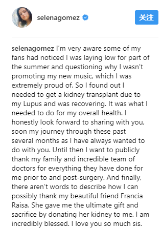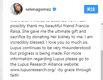 Selena在ins上说红斑狼疮的病人依然被世人误解,她希望自己的病情和大家分享,可以消除社会对狼疮病人的歧视。