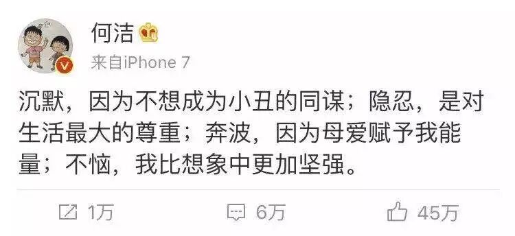 随后,何洁转发了这位妈妈的微博,并配文:「从小我被保护得很好,后来在社会中遇到挫折措手不及,我反思过:怎样让孩子面对挫折?让他做温室花朵还是看他跌倒自己爬起来?我选择后者。有时我这妈妈显得冷酷甚至残忍。其实对孩子溺爱才是最大的残忍-因为让他失去了磨砺成长的机会。」