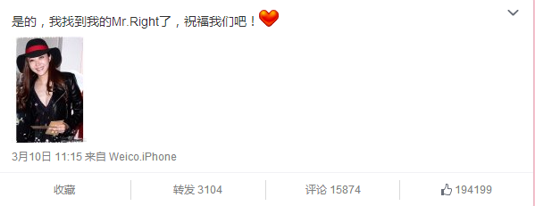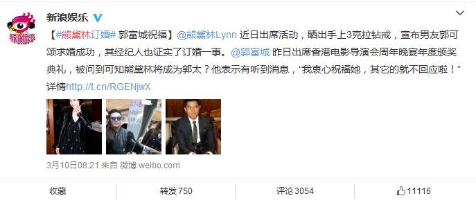 3月10日新浪娱乐爆出女神熊黛林订婚,当日中午女神在微博发文“是的,我找到了我的Mr.Right了,祝福我们吧!”