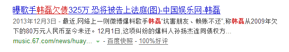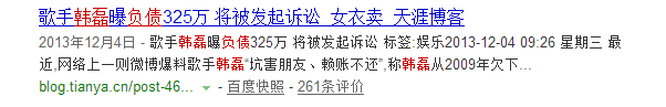 可是13年底韩磊却被爆料负债高达325万元!爆料人孙扬杰称,韩磊曾与韩岚合伙开了一家文化传媒公司,但由于资金与公司运营吃亏等问题,两人产生了摩擦。两人合伙开公司时的注册本钱是债权人一人出资,债权方甚至借给韩磊245万元作为注册资金,这笔资金至今未收到还款。另外再加上私人借款的80万元人民币,韩磊总共欠下了325万元。