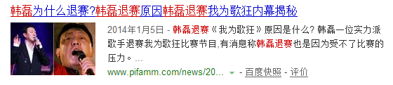 韩磊加盟《我为歌狂》也被爆出输不起,太爱面子。录制一期之后就退赛,因为第一期节目录制完,韩磊发现这是一档“动真格”淘汰制节目,而且歌手须在“密室投票”全程真人秀的投票,整个赛制尤为残酷,已身为“央视青歌赛评委”的韩磊倍感被淘汰舆论等无形压力。