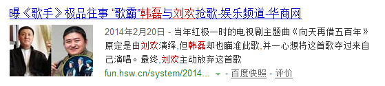韩磊趁势在圈内大肆渲染,故意扩散这件事情。最终,刘欢主动放弃了这首歌。后知道事情原委的刘欢和韩磊之间因此结下了梁子,而韩磊又是不服输的性子,前段时间刘欢参加了一个音乐节目名利双收。
