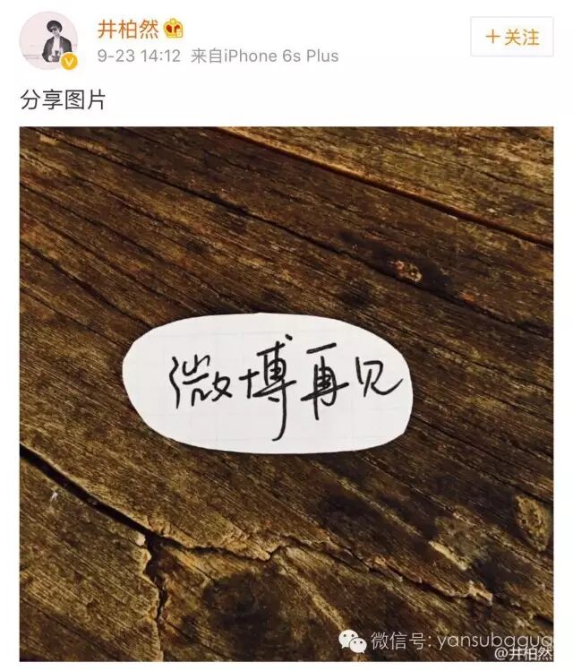 上个月,井柏然退出微博袅~~留下“微博再见”手写字条图片,还关闭了评论。