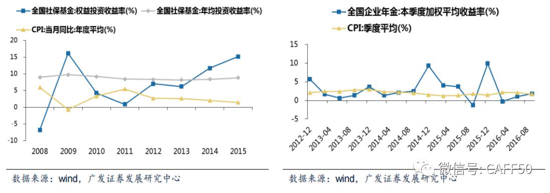 从投资业绩看,年金和社保类产品的长期回报还是十分理想的。根据广发证券的统计,经过十年多的发展,国内养老金累计结余接近4万亿,其中,可(交给社保基金)纳入投资运营的规模大致为2万亿。全国社保基金的年均投资收益率长期在8%以上,其中,权益类资产的收益率的长期均值在6.81%(如果剔除08年 股灾的影响,09年-15年的长期均值为8.75%),投资收益远高于CPI; 2012年-2016年三年间,企业年金的平均收益水平为2.94%,也高于同时期CPI均值的2.01%(年金组合的投资收益普遍低于社保主要原因在于投资范围和权益投资比例不同)。