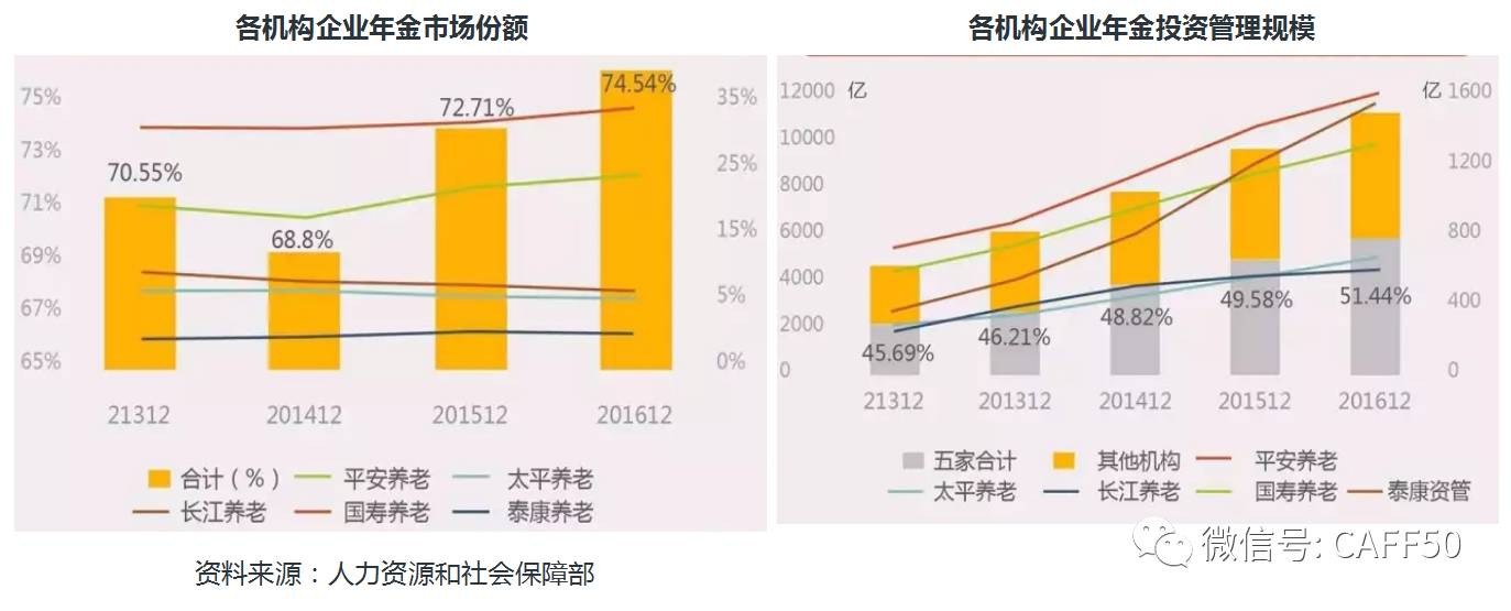 无独有偶,我们看到,在年金的投资管理方面,保险系投资管理人的优势在近几年也在持续扩大。2008年,保险系和基金系投资管理人的市场占比分别为46.9%、44.4%,相差无几。2015年,保险系投资管理人规模占比达50.77%,2016年达52.71%,其中前三家均是保险系公司,份额合计达40.05%。从增量看,2015年及2016年,投管规模排名前三的公司净增投管规模占全国净增分别为44.81%和50.68%,占比接近全国21家持牌机构净增的半数,净增份额排名前四名的机构(泰康资产、平安养老、国寿养老、太平养老)都是保险系,合计净增份额达59.29%。保险机构在进行大量、长期的资产配置方面具有明显优势:各类资产储备丰富,大类资产配置体系成熟,研究体系全面、交易对手多元化,产品运营经验丰富等等,正好匹配企业年金这类对于风险和收益都有较高要求的产品。