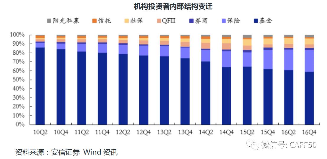 不同类型投资者在交易机制、信息优势以及市场预期等方面存在差异,投资者结构的变化将对市场风险偏好和风格产生显著影响。过去两年时间里,市场经历异常波动之后,杠杆水平及融资交易量降至低位,低风险偏好的绝对收益投资者不断取代散户甚至公募基金(公募基金多以相对收益为主要考核目标),市场风格转为追求低波动、低回撤下的收益稳健增长。机构择股理念已从过往注重信息优势和交易驱动,逐渐转变为深度价值和业绩为王。分析这类以追求绝对收益为目标的机构投资者的行为,对于深刻理解市场运行特征和行情的本质具有重要意义,这类机构投资者,除了传统公募基金之外(主要是公募基金中以追求绝对收益为主要目标的年金/社保/专户等非公募业务部门),以保险公司为代表的资管机构是重要组成部分,且在2010年以后,保险机构的投资行为对市场的影响力明显增强。
