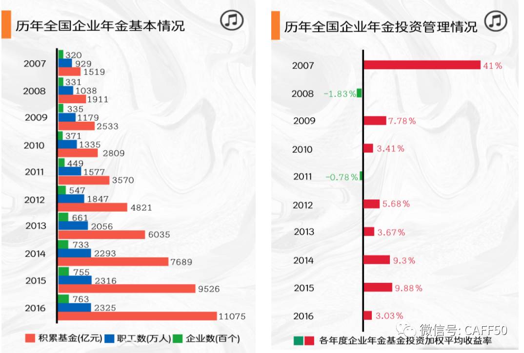 自2000年国务院印发的《完善城镇社会保障体系试点方案的通知》中首次提出“企业年金”这一概念至今,企业年金已走过16年春秋,据人社部披露的统计数据,截至2016年底,全国有7.63万家企业建立了企业年金,参加职工2324.75万人,积累基金11074.62亿元,实际运作资产10756.22亿元,双双突破万亿规模。