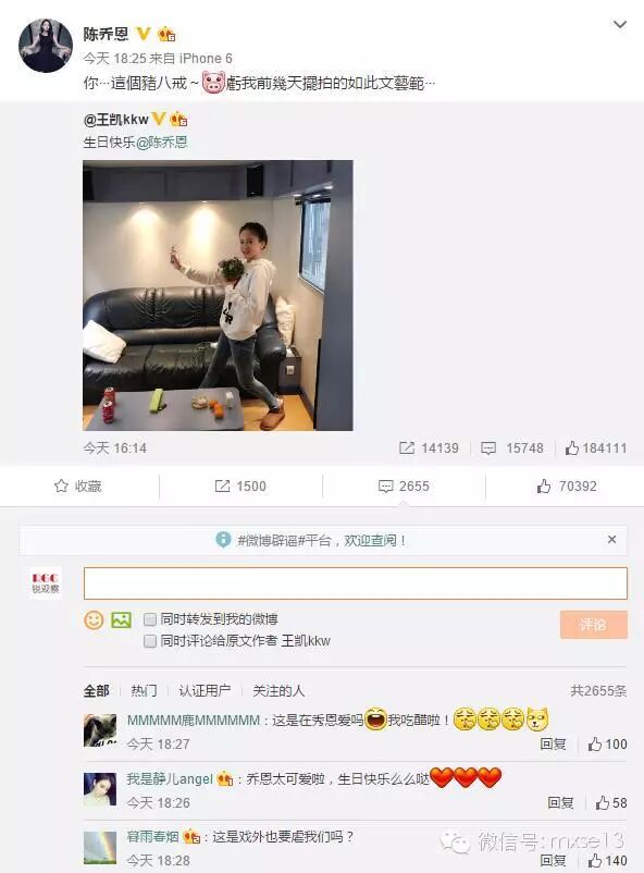 粉丝们满满的一大波祝福,一点都不担心两人“厮混”在一起。倒是陈乔恩戏骂道王凯,你⋯這個豬八戒~虧我前幾天擺拍的如此文藝範⋯