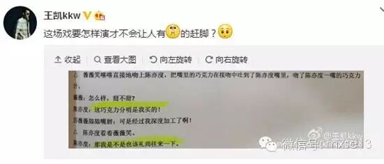 王凯在微博晒《放弃》剧本称:“这场戏要怎样演才不会让人有吐的赶脚?”原来,剧本写着女生要将自己嘴里的巧克力吐到男生嘴里。