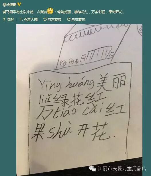 3月12日,马伊琍在微博晒出8岁大女儿爱马用拼音和汉字写的一首诗:“爱马同学有生以来第一次赋诗:莺黄美丽,柳绿花红,万条彩虹,果树开花。”并配上鼓掌表情为女儿点赞。