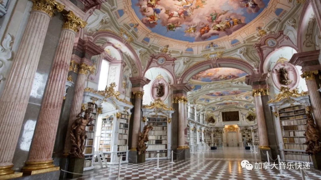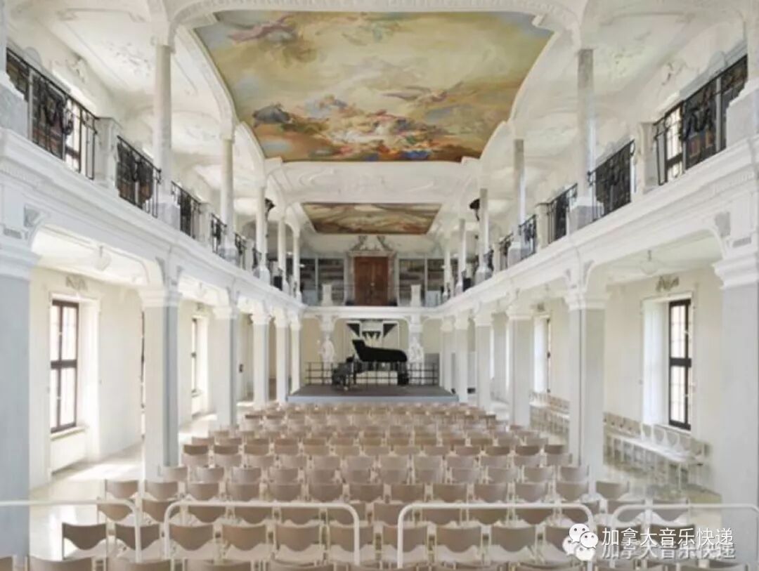 位于大皇宫北面的图书馆音乐厅(Bibliotheksaal)修建于1783年,两层室内建筑,前身是一座全白色古典主义风格的图书馆,特用于此次大师班上课用音乐厅。但是二层还是保留着18世纪古老图书馆的模样。