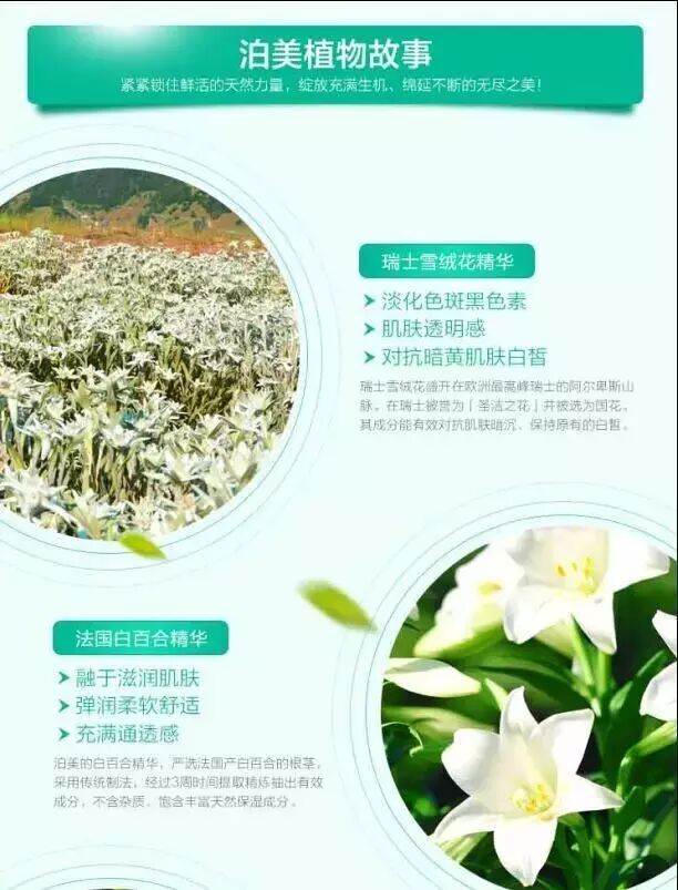 泊美基于此概念推出全新产品——鲜纯珍萃保湿系列及鲜纯珍萃美白系列,经研发团队悉心寻觅、“严格挑选全世界出类拔萃的新鲜植物精髓,提取植物自身的力量,高纯度封存每一滴精萃的新鲜、活性,令肌肤感受天然植物的鲜活力量”,向更美好的“鲜活肌”蜕变。