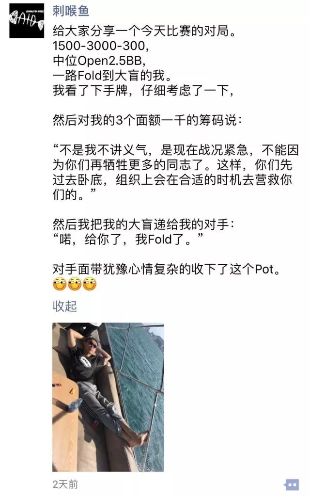 刺喉鱼老师真的是很幽默哈哈哈,这次他参加比赛,他自己说自己这次WSOP CHINA玩得很愉快!