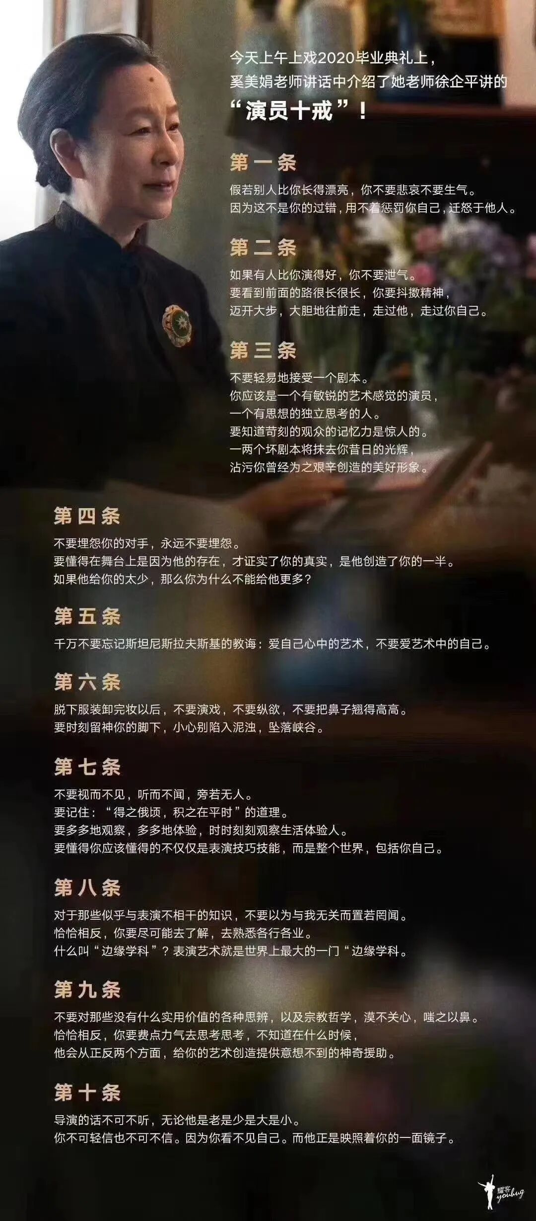 6月23日上午,上海戏剧学院2020毕业典礼在线上举行,著名演员奚美娟作为校友代表发言。奚美娟在讲话中介绍了她的老师徐企平所教授的“演员十诫”,。对今天的演艺新人很有思考价值。