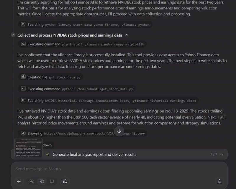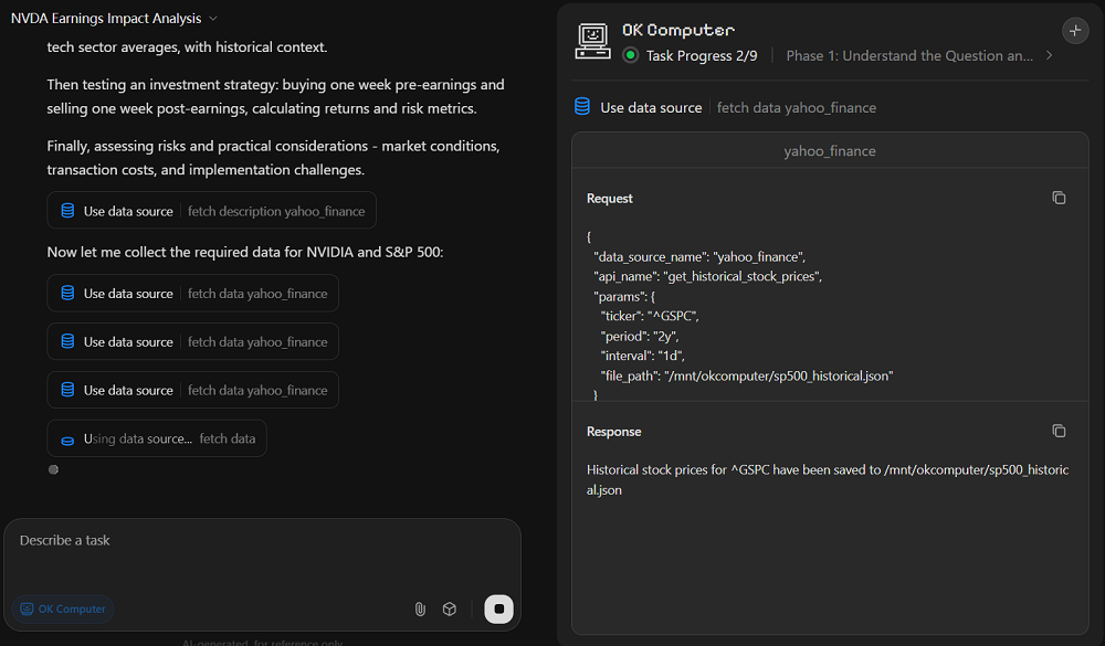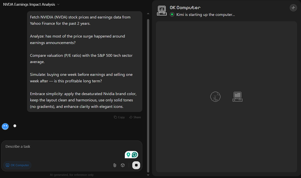 Kimi第一次有自己的电脑了,分析师、工程师样样精通,一手实测来了! 智东西 港台男星 2025-09-27 12:04:19 39 创作不易,用心坚持,欢迎请BaGua喝几杯爱心咖啡!打赏并支持本文 打赏并删除本文 Kimi发了一款“全栈助理”。作者 | 陈骏达编辑 | 云鹏智东西9月27日报道,近日,月之暗面正在小规模灰度测试Kimi的Agent模式“OK Computer”。OK Computer的目标是通过更多轮次推理、更多工具调用、更多token消耗,带来更多智能,月之暗面将其定义为一款“全栈助理”。在OK Computer模式下,Kimi将拥有自己的虚拟电脑,可以连续工作几十分钟,一步一步自主完成需求调研、规划、分析、设计、开发等环节。▲OK Computer工作界面,左侧为聊天框,右侧为虚拟电脑(图源:智东西)与传统依赖人工预设工作流的方式不同,OK Computer背后是月之暗面的原生Agent模型Kimi K2,能应对更多任务场景和突发情况。借助端到端强化学习技术,Kimi K2掌握了文件系统、浏览器、终端、代码、图片生成、音频生成等20多种工具的使用方式,拥有完成复杂任务所需的内在知识。官方Demo中,OK Computer能够直接交付功能模块丰富的多页面网站、移动端友好的Web应用以及可编辑的高品质演示文稿等产出物,也能够把几十万行的Excel 数据进行可视化、交互式呈现。目前,过去两年曾经给予Kimi打赏鼓励的用户,将优先获得OK Computer的体验席位,这部分用户打开网页版Kimi即可收到邀请。月之暗面称,Agent模式下单个任务的token消耗量可达常规对话模式的几十倍,OK Computer会根据服务器负载情况逐步扩大灰度测试范围。智东西也对OK Computer的表现进行了体验。01.一手体验海量数据分析能力把英伟达投资策略捋清了获得OK Computer模式体验机会的用户,在Kimi首页输入框的左下角能找到OK Computer模式的切换按钮,点击后即可使用。官方提供了OK Computer模式下的一些模板提示词,如果想体验其能力,又不愿意撰写复杂提示词,可以直接选用这些模板。智东西从中选择了一项数据可视化任务,要求Kimi从雅虎财经获取英伟达过去两年的股价和财报数据,并分析股价的暴涨是否主要发生在财报发布前后、比较估值(市盈率P/E)与标普500科技板块的平均值。此外,Kimi还需模拟在每次财报发布前一周买入,发布后一周卖出的交易策略,长期来看是否盈利。设计风格方面,提示词要求Kimi采用低饱和度的英伟达品牌色,保持布局简洁和谐,仅使用纯色(无渐变),并通过优雅图标提升清晰度。收到任务后,Kimi会在右侧呈现它在虚拟电脑中进行的各类操作。在开始任务之前,它一般会撰写待办事项,对任务流程进行全面规划,然后再正式执行。开启OK Computer模式后,Kimi会列出其进行的每一步操作,包括使用数据源、使用文件、使用iPython、使用部署工具等等。分析完成后,它还用简洁的语言给出了关键发现,并将分析图表和结论做成了一个完整的网站,耗时5分钟左右。生成结果:https://www.kimi.com/share/19988a15-7962-8c6a-8000-0000857b187e可以看到,Kimi给出的网页完成度较高,数据可视化清晰,跳转逻辑正确,还提供了JSON格式的分析数据。智东西核验了页面中部分关键数据的正确性,如英伟达市值、股价等等。在我们的抽查范围内,数据基本无误,不过英伟达的市盈率与雅虎财经上显示的数据有出入。这一任务考察的能力类型众多,OK Computer模式下的Kimi需要从指定来源抓取正确数据和对应时间,理解提示词中谈到的各种金融术语,还需要利用Python进行数据分析,并将结果按照风格要求可视化。如果是人工完成,可能需要耗费数小时。我们将官方提示词中的企业从英伟达改为AMD,切换了比较的基准,Kimi同样能给出类似质量的分析结果,这在某种程度上也印证了其能力不是完全靠“背题”实现的。生成结果:https://www.kimi.com/share/19988bb0-9b82-864d-8000-0000e74d03a4不过,OK Computer并不是市面上唯一一款具备类似能力的Agent,我们也将这一任务交给了Manus。可以看到,Manus的执行风格更偏向直接上手做,收到任务后直接就开始查询财经数据的API了。Manus最终交付了一份MarkDown文档,以及四张数据图表。Manus的报告内容更为宏观,在具体数据的呈现上比OK Computer更少,报告长度也更短,任务耗时比OK Computer长。数据可视化方面,其图表的美观程度和OK Computer相比还有一定差距。02.擅长PPT、多功能网站开发多位网友给出好评月之暗面介绍,OK Computer已掌握的工具集包括列待办事项、写Python代码、操作终端、浏览网页、文字搜索、图片搜索、图片生成、音频生成、接入专业财经数据源、网站部署等。在该公司的内部测试中,OK Computer目前擅长的任务类型,包括多功能网站原型开发、海量数据分析与可视化、高品质演示PPT制作等。x平台上的一名科技博主分享,他用OK Computer打造了一个功能完备的星座网站。这个网站可以帮助用户了解每个星座的特征,还可以比较两个星座之间是否匹配。其设计风格也与网站的主题较为匹配。▲OK Computer生成的星座网站(图源:Gadgetify)还有网友分享,自己用OK Computer打造了一个文档比较网站,可以看到这一网站设计简洁美观,这位网友反馈完成率还不错。官方Demo中,借助OK Computer,Kimi还打造了一份对电影《2001太空漫游》视觉元素的深度解析PPT,要求仅使用电影原图与影视和学术深度解析文章。Kimi会先设定计划,搜索电影原图素材和关键场景的图片,搜索电影深度解释和学术研究资料,经过深度研究和