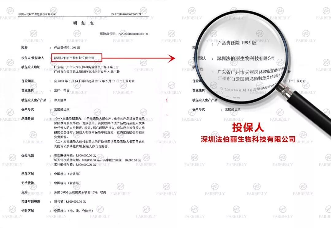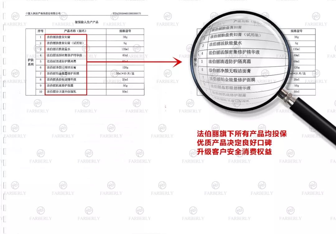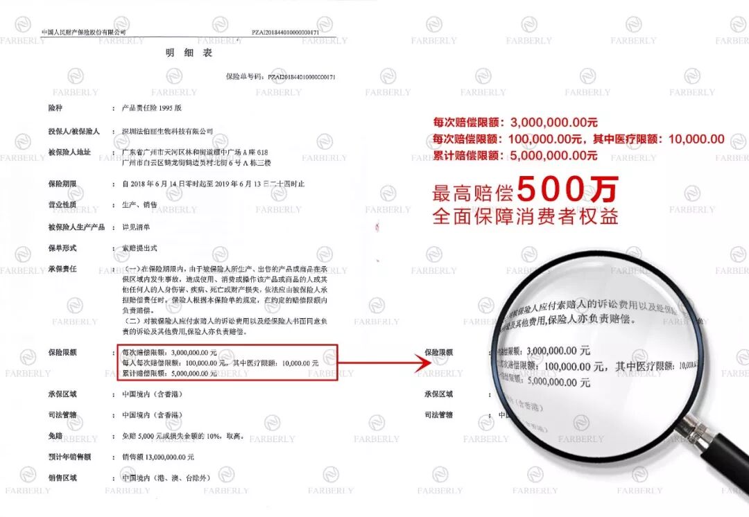 秉承着“安全·品质”的企业经营理念,法伯丽始终在产品研发、生产和销售方面精益求精,旗下产品自上市以来,依靠着安全、有效的口碑获得了广大消费者与化妆品行业的好评与肯定,赢得客户的信任,为了更好的提高客户满意度,法伯丽与PICC合作,为旗下产品投保500万产品责任险,全新升级广大消费者的权益保障,更全面保障客户的利益!