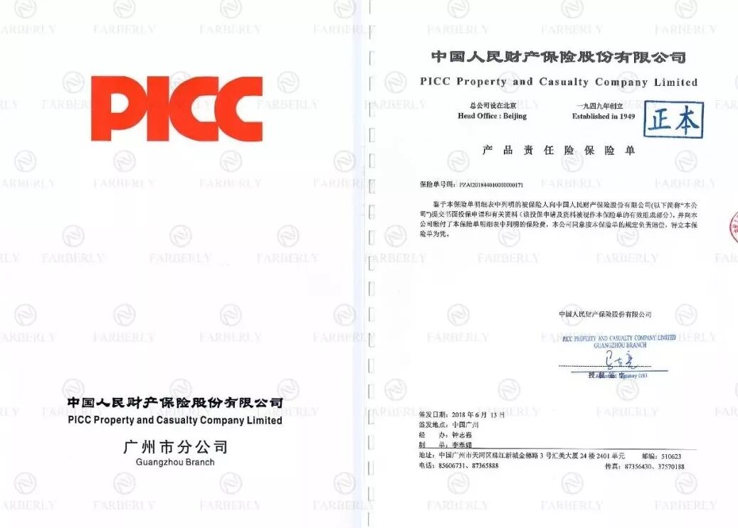作为世界500强企业,PICC在为企业产品进行投保前,会对投保的产品进行严格的质量审查,法伯丽的产品依靠 “过硬”的自身功夫,层层突破PICC严格的质量审查,成功投保500万,更全面保障客户的权益!