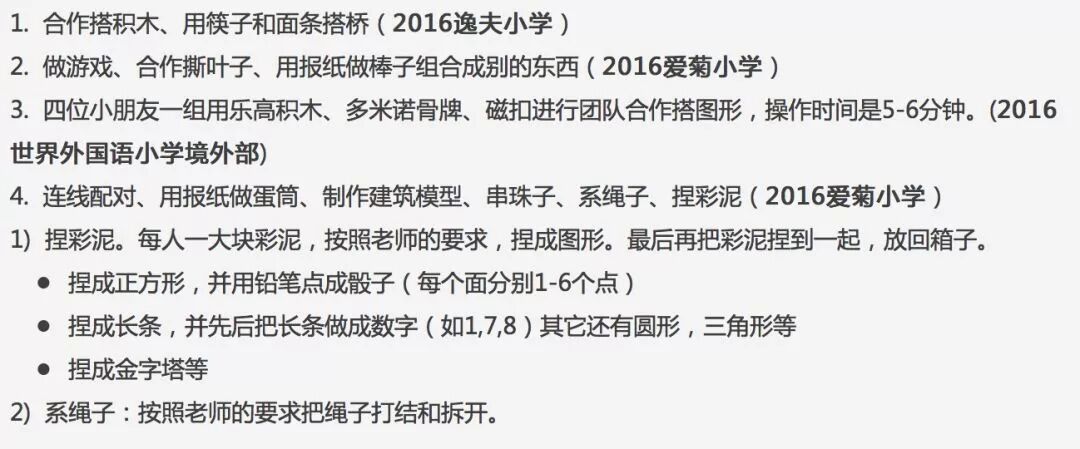 千万不要以为机械的考试结束就结束了,学校还会考察孩子有没有团队合作的能力,会把小朋友们分成4-5个人一个小队,给他们布置任务,让他们齐心协力去完成。下面这些都是幼升小面试时实打实出现过的考题: