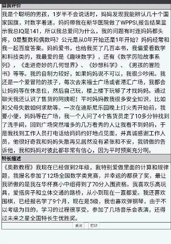 类似这样牛掰的简历还有很多很多,就问大家服不服吧?我不懂的是娃都这么牛了为什么还要绞尽脑汁浪费时间去读一年级,这么牛的娃直接上高中或大学不好吗?还能节省一些时间早点上社会赚钱呢!