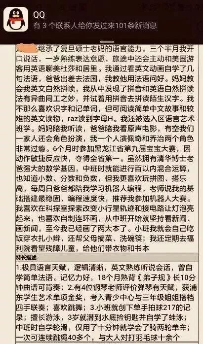 妈妈复旦硕士,爸爸清华博士,生出来的娃三个半月会开口说话(这里是否科学再说),一岁就能熟练地用英文与外国人聊天,还能自学法语,中班就会小数、分数这些小学四年级才学的内容,还会科技,3岁潜水底,10分钟学会两轮单车……(我当初看见这个简历觉得应该是见到了超人)