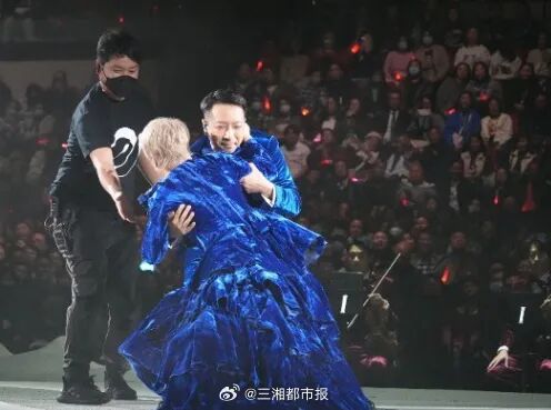 该场演唱会,陈慧娴身着深蓝色公主裙,脚踩近20厘米高跟鞋,全身心地投入演绎经典曲目《明日有明天》。表演结束后,她转身返回台中时,不慎踩到了裙脚扑倒在台上。同在舞台上的音乐人何秉舜反应迅速,将摔倒的陈慧娴扶起。