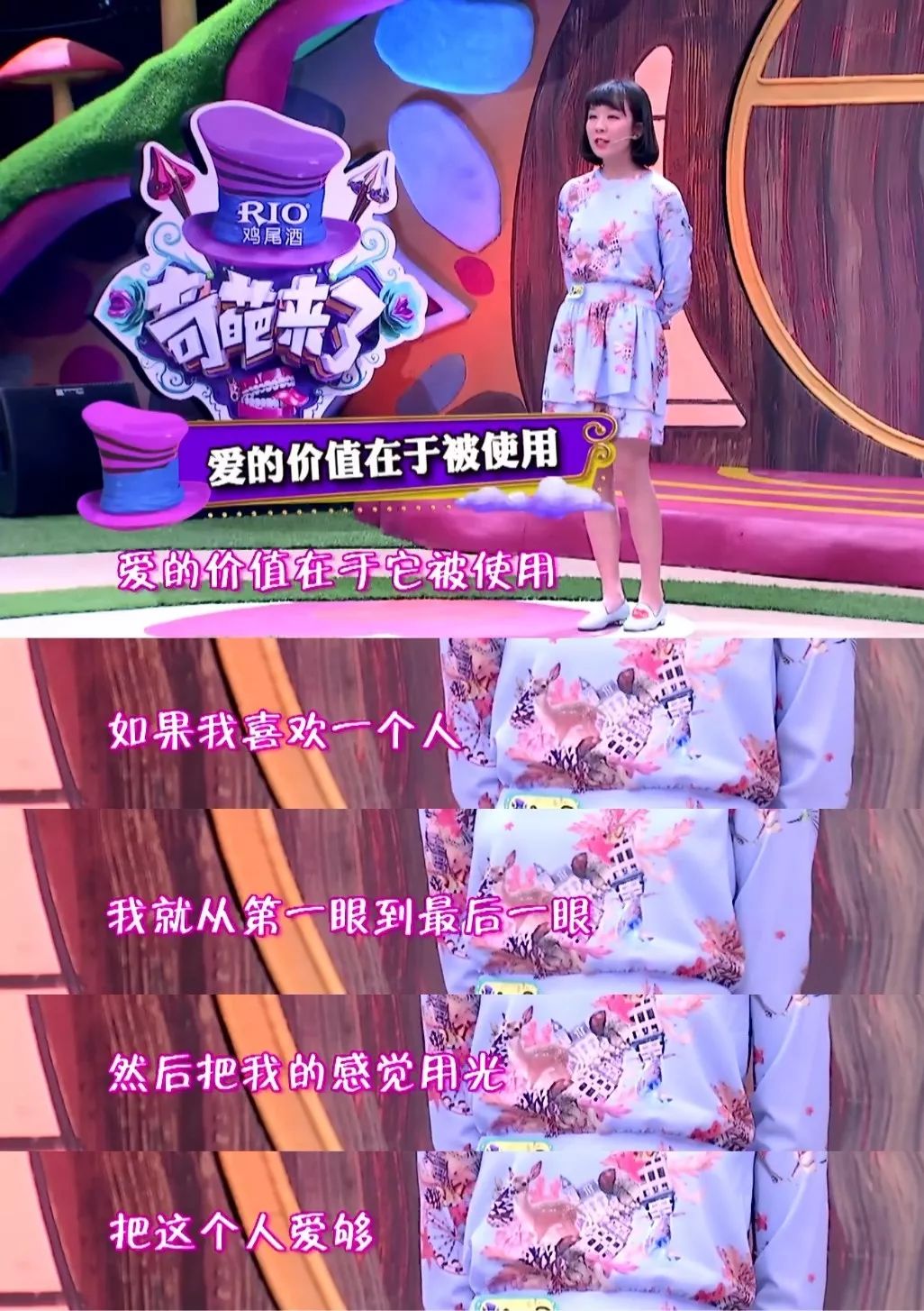 有一季《奇葩来了》,张晓晗在讨论:“从未在一起和最终没有在一起哪个更遗憾”。她说: