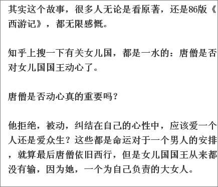 为什么我最喜欢西游记里面女儿国这个桥段,因为这是女性主义在古代萌芽的开端。无论时代怎么变迁,总有一些姑娘,面对自己一见钟情的爱情,但行好事,不问前程。从不错过自己的每一次心动,哪怕头破血流。
