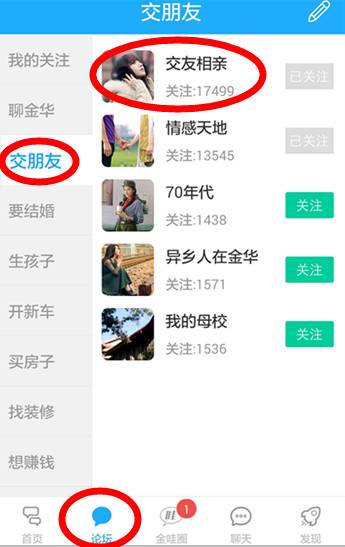 2、进入APP--点击底部“论坛”--交朋友--交友相亲,就能在茫茫人海中立刻找到那个TA!