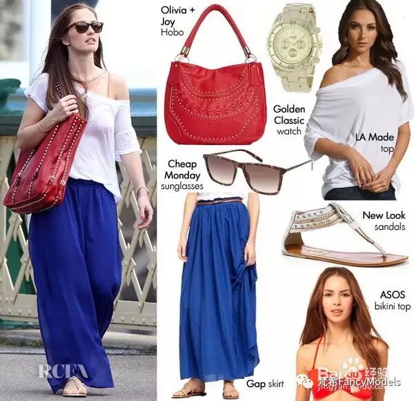 Minka Kelly 用一件宝石蓝的长裙搭配白色的T恤,强烈的色彩对比下使得整身的搭配变得活泼不少,大斜肩的设计,裸露的肩部性感无敌。
