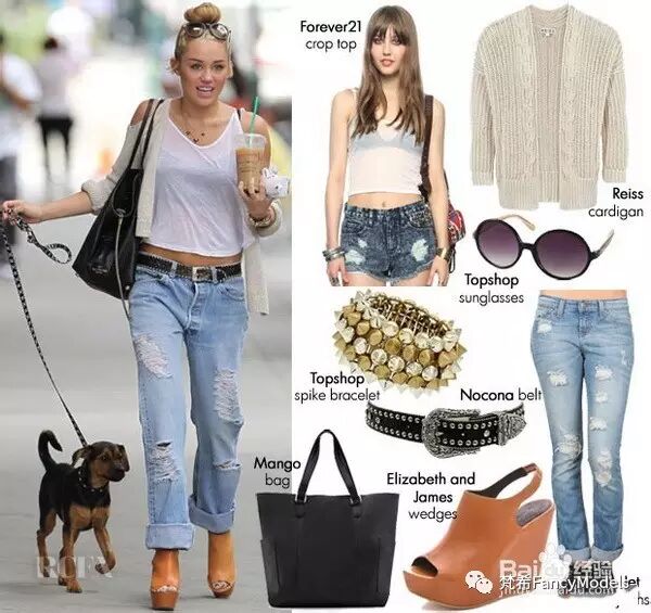 Miley Cyrus 露双肩的T恤流行了几季但是依旧风采不减,搭配一条蓝色的破洞牛仔,欧美范的随性感十足。