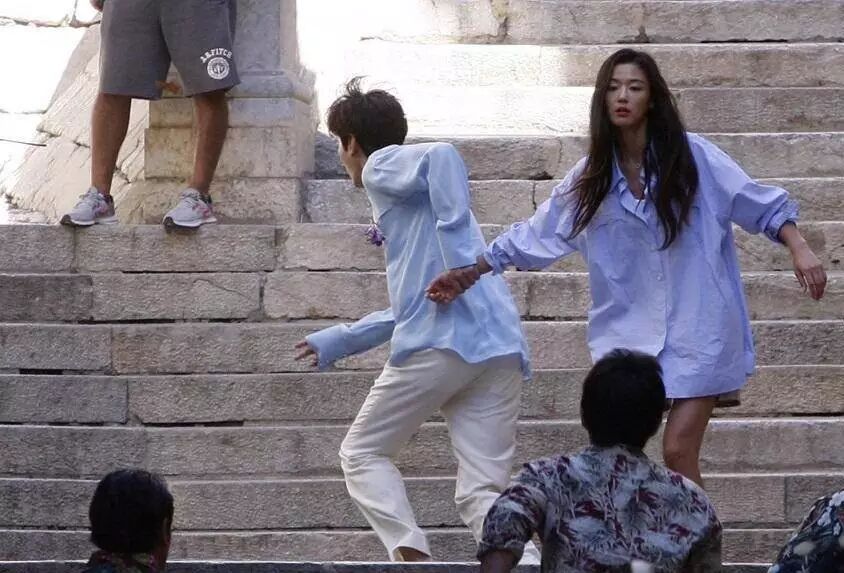 哈哈,开个玩笑啦,这是前段时间全智贤和李敏镐的新剧《蓝色大海的传说》曝光的拍摄路透。不同于上文中的端庄优雅,路透照里的欧尼简直还是个清新少女啊!产子归来的全智贤容貌未改,身材未变,大长腿实力吸睛,一身蓝色衬衫干净清新,赏心悦目。