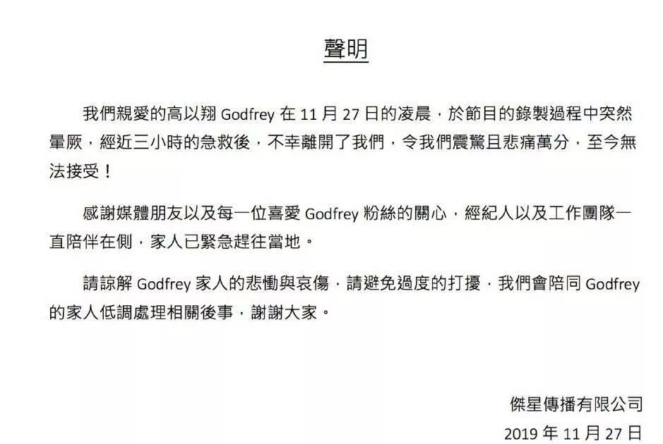 11月27日凌晨,著名艺人高以翔在录制节目过程中逝世,其生前所在的经纪公司发布了相关声明: