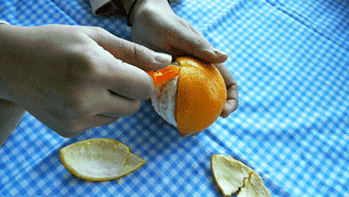 橙子的表面光滑细腻、色泽艳丽,皮比较薄,用工具轻轻一划一剥,鲜嫩橙黄的果肉就出现在你面前了。