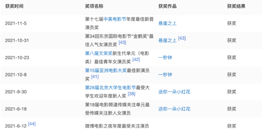 但看一下刘浩存的获奖列表,可以发现出道刚刚一年的她,奖项已经超出了许多成熟的女演员。