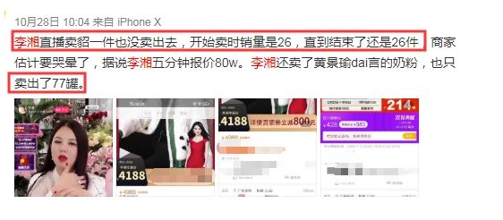 李湘,太能吹了吧? 吃瓜有料 内地女星 2019-11-14 13:23:33 927 创作不易,用心坚持,欢迎请BaGua喝几杯爱心咖啡!打赏并支持本文 打赏并删除本文 一年一度的双十一终于结束了,各位,你们的钱包还好吗?今年除了突破新高的销售量,淘宝上各大主播的话题度也异常的高。李佳琦薇娅这两个名字,近段时间比明星还要火,说他俩是淘宝阵营的男女销售王,毫不夸张。今年双十一,在两个带货王中间,还有一个曾是专业主持人出身,转行做主播的李湘,也很亮眼。双十一结束的第二天,李湘在微博上发了一个战报,宣布自己是“第一带货明星”,直播当天销售额累积成交1.3亿元,累积总观看人数3000万+人次。看这成绩,真的挺厉害的。可没过多久,这个第一就被网友发现了端倪,通过官方给出的统计数据和结果,李湘在双十一明星带货排行榜上并不是第一,而是25名的位置。李湘的消费指数只有19.67,排名第一的,是朱一龙。在这个明星带货力排行榜上,李湘的确排过第一,只不过是4月份的数据。这次李湘自宣是带货女王,立刻引起网友质疑,但毕竟两方算法不一样,出现偏差也有可能。虽说自己是第一带货的明星,但说实话,在直播界,明星这个title已经不吃香了,大家更多倾向于选择观看李佳琦或是薇娅的直播间。两大带货主播还没发战报,李湘就抢先一步给自己安了第一的头衔,引起不少网友的反感。自从李湘宣布担任淘宝主播以来,这已经不是她第一次翻车了,一次次的失误,已经消耗了大多数网友对她的信任度。从5月开始,李湘就开始尝试转型当主播,一句“听湘姐的!买就对了!”洗了不少人的脑。后来正式转型做主播,开设专属自己的直播间,从“主持李湘”变成了“主播李湘”。毕竟之前是混娱乐圈的,前期除了拿自己的名气拉关注度,后期她还邀请了许多明星来她的直播间卖货,吸了不少粉丝。像一开始在淘宝试水直播时,就有之前的一些老朋友转发李湘的微博为她造势。后来卖红酒的赵薇,卖拌饭酱的林依轮,卖化妆品的张庭,卖面粉的那英都跑到她的直播间卖货。看到自己人气上来了,李湘也是非常努力,直播次数非常频繁,而且每次直播的时间都超过3个小时。为了吸引粉丝流,李湘会直播撕卫生巾,让小助理直接喝精华液。真的拼了。可随着粉丝越来越多,知名度越来越高,李湘宣传,卖过的一些产品,也被网友发现了不少的问题。第一,李湘带货能力没有她吹的那么强。直播卖貂,过了5分钟一件没有卖出去,而且据说李湘对卖家口播的报价高达80w。后来直播卖奶粉,也只卖出了77罐,这个带货能力真的有些差。对此,李湘也马上发微博回应了,她称因为团队选品错误,并未为网友带来物美价廉的商品,以后会规避掉这些问题。但网友并不吃她的解释,认为价格贵不是她卖货能力差的唯一问题。第二,李湘卖货态度很有问题。作为卖货主播,参与选品和背下来一些关于产品的信息是一个合格主播的基本。我们看一些主播,他都对网友提出的问题给予准确的回答,这也是他们工作的一部分。可是到了李湘的直播间,对于产品她了解甚少,介绍产品时,一直看着旁边的提词器。卖口红,不在自己嘴上试色,而是拉助理到镜头前展示口红颜色。卖吃的,自己不尝,随意搅拌一下就放在旁边。对待产品不认真,但李湘对于自己的妆容和仪表,还是很在意的。每次直播,她都穿的异常精致,还要时不时的晒出自己的大钻戒。GQ写的一篇报道里,曾提到知名主持人李姐在做直播的时候,特别在意自己的妆容仪表。瘦脸一定要开,光一定要打的好看自然,磨皮美颜必须到位。背景墙一定要完美,遇到不满意的就要重新拿花,重新补色。一切准备完毕后,李姐才能坐在椅子上安心直播。GQ虽然没有指名道姓说是谁,但看这描述,都难免让人认为在影射转行做主播的李湘。对于网上的一些批评和不满,李湘本人倒是想得挺开。早在9月份,她就在微博上回应过转型做主播的事情,说自己只是想让大家拥有愉快购物时光,何必上纲上线。顺便还晒了一辆豪车。言外之意:姐不差钱,只是出来玩玩而已。她也不是吹的,李湘从小就不差钱,妈妈是做汽车生意的,本身家庭条件就很优越,父母对她也很好。在蜜罐里长大,从小被宠大的李湘,还特有自己的主意。还在上高中时,李湘就因为优秀的成绩保送到了天津大学,为了完成自己的主持梦,她跑去考了中国传媒大学。毕业回到湖南卫视做主持人也顺风顺水,是当时真正的主持一姐。口碑声誉都有了,李湘又不老实,辞职后离开湖南卫视,后来又和相恋33天的李厚霖闪电结婚。当时两人结婚阵仗很大,许多娱乐网站都为李湘的大婚做了专栏,专题报道。结婚当天李厚霖送给李湘3克拉的粉色钻戒,婚礼现场李湘热泪盈眶。事业有成,还嫁给了钻石大亨李厚霖,当时的李湘可以说是人生赢家。可结婚没多久,网上就有谣言传李厚霖有暴力倾向,两人要离婚的消息从结婚后就没断过。时间过了快两年,李湘终于在自己的博客上对外宣布已经和李厚霖离婚,至于原因,他们未对外界提过。在博客里,李湘称李厚霖是个好人。李厚霖后来也回应:我们分得很平和。两人分手还算体面。离婚没多久,李湘就受到了作家张一一的公开求婚。对此李湘只表示自己已经“心有所属”,而李湘嘴里的心上人,就是现任老公王岳伦。为了王岳伦的事业,她把在北京的一处房产卖掉换来了《十全九美》。好在这部电影没有赔钱,也