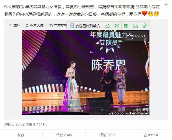 对于陈乔恩的“黑洞”,只有看过《旋风孝子》节目的人才能懂得这是陈乔恩之日常。敢素颜、能爬树、看墓碑、吃鸡头、鱼头、猪头、鸭脑、鱼眼睛的恶趣味……就是这样一个“重口味少女”,却在昨天,女神节的这天,拿到了年度最具魅力女演员的奖。