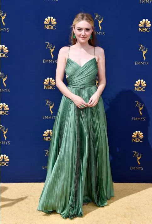 好莱坞高颜值少女达科塔·范宁(Dakota Fanning)也有出席艾美红毯,穿了件波西米亚风的绿色百褶裙,品牌出自Dior 2018秋冬高定系列,非常华丽。这次由她主演的《沉默的天使》也有获得最佳限定剧提名。