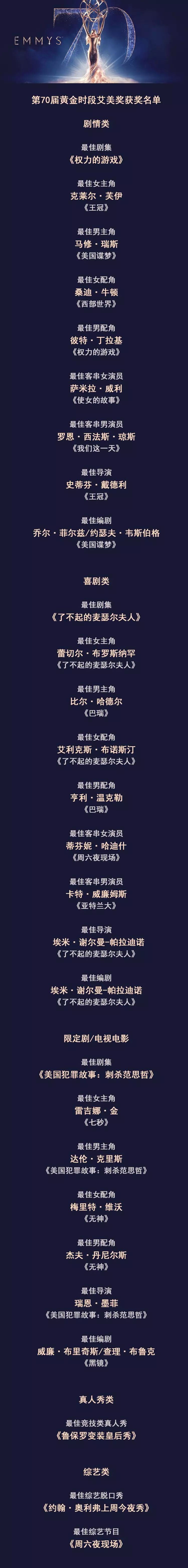 在今年艾美奖的提名中,《权力的游戏》以22项提名领跑,紧随其后的是《西部世界》与《周六夜现场》,二者分别获得21项提名。