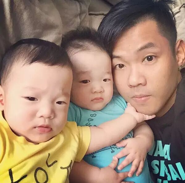 ▲陈建州与俩儿子,弟弟翔翔拖着爸爸下巴