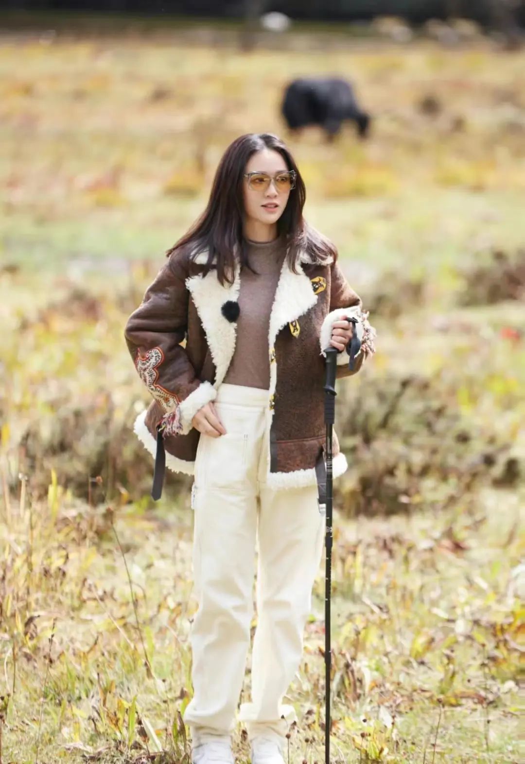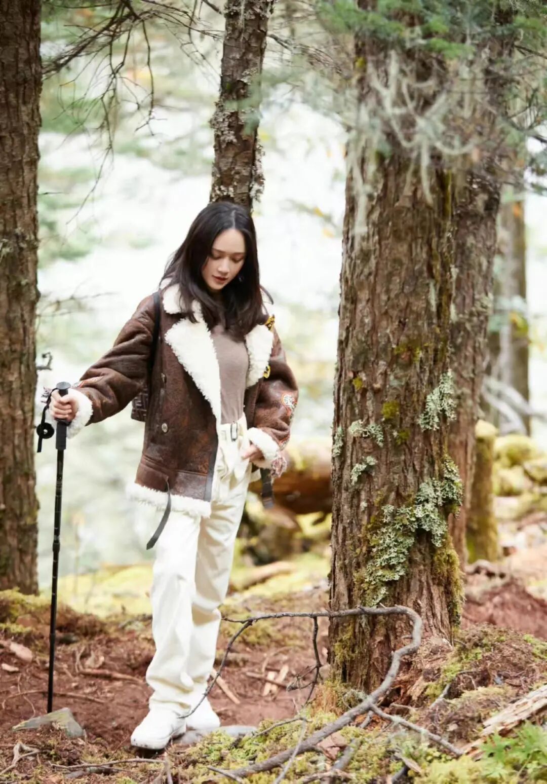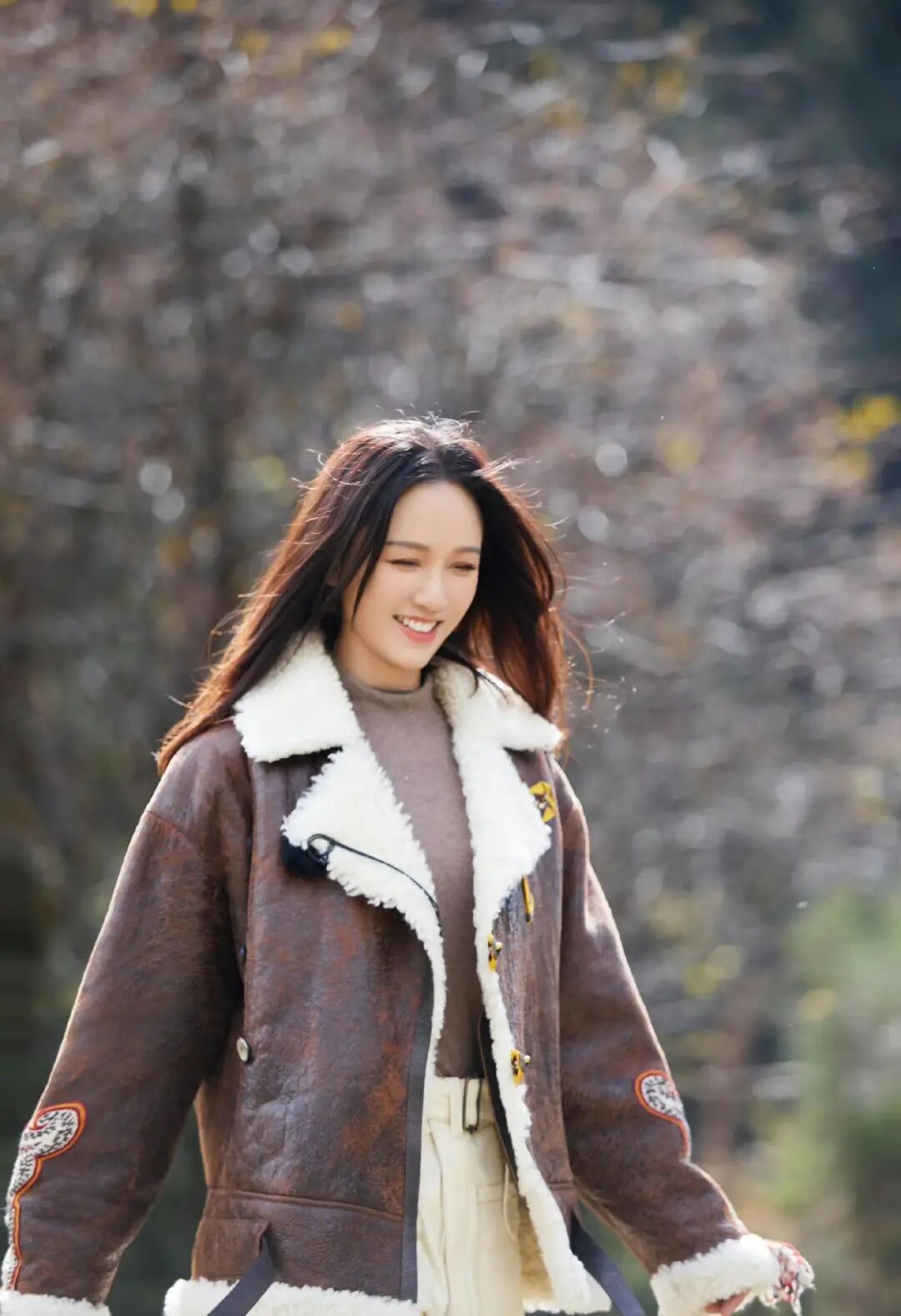 只见她挑选了一件修身立领的羊毛衫打底,外面穿一件棕色的毛绒内衬皮夹克,到了秋冬季,很多女性都喜欢穿皮夹克,它是当下时尚圈中的流行单品,不过风十分保暖,打造出又甜又酷的造型,将女性的时髦个性美展示出来了,特别时尚又吸睛。