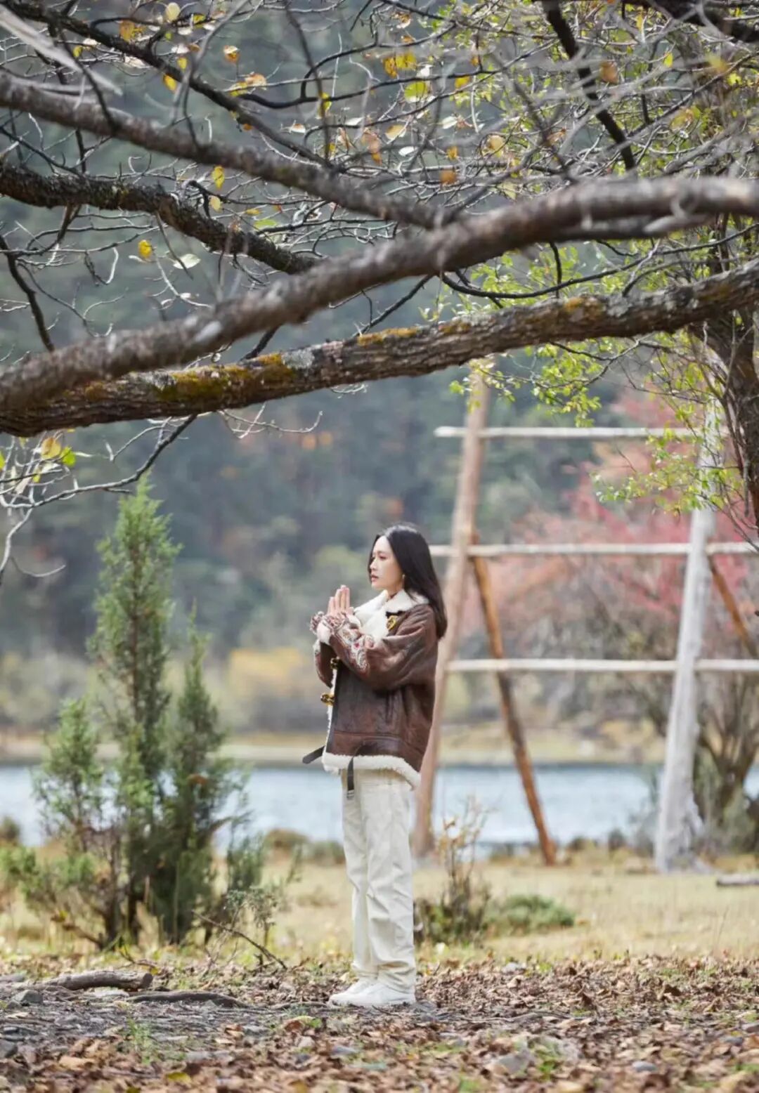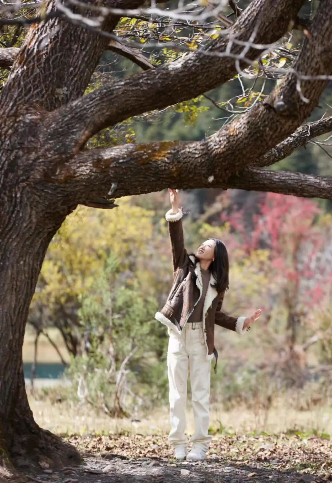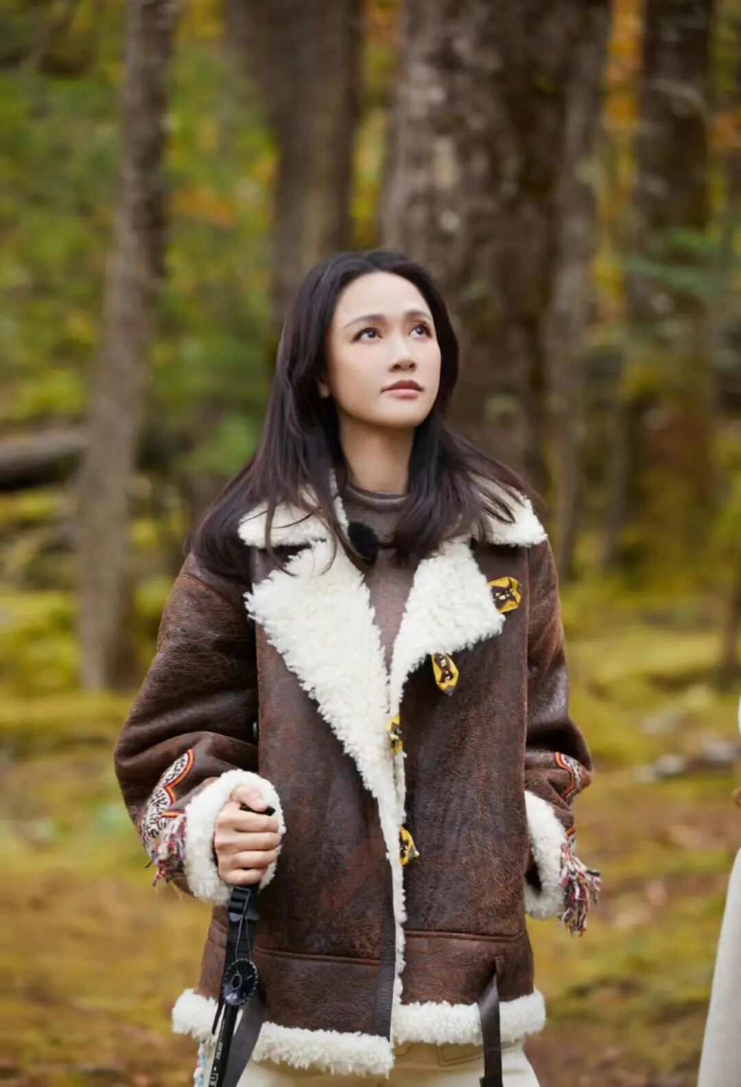 只见她挑选了一件修身立领的羊毛衫打底,外面穿一件棕色的毛绒内衬皮夹克,到了秋冬季,很多女性都喜欢穿皮夹克,它是当下时尚圈中的流行单品,不过风十分保暖,打造出又甜又酷的造型,将女性的时髦个性美展示出来了,特别时尚又吸睛。