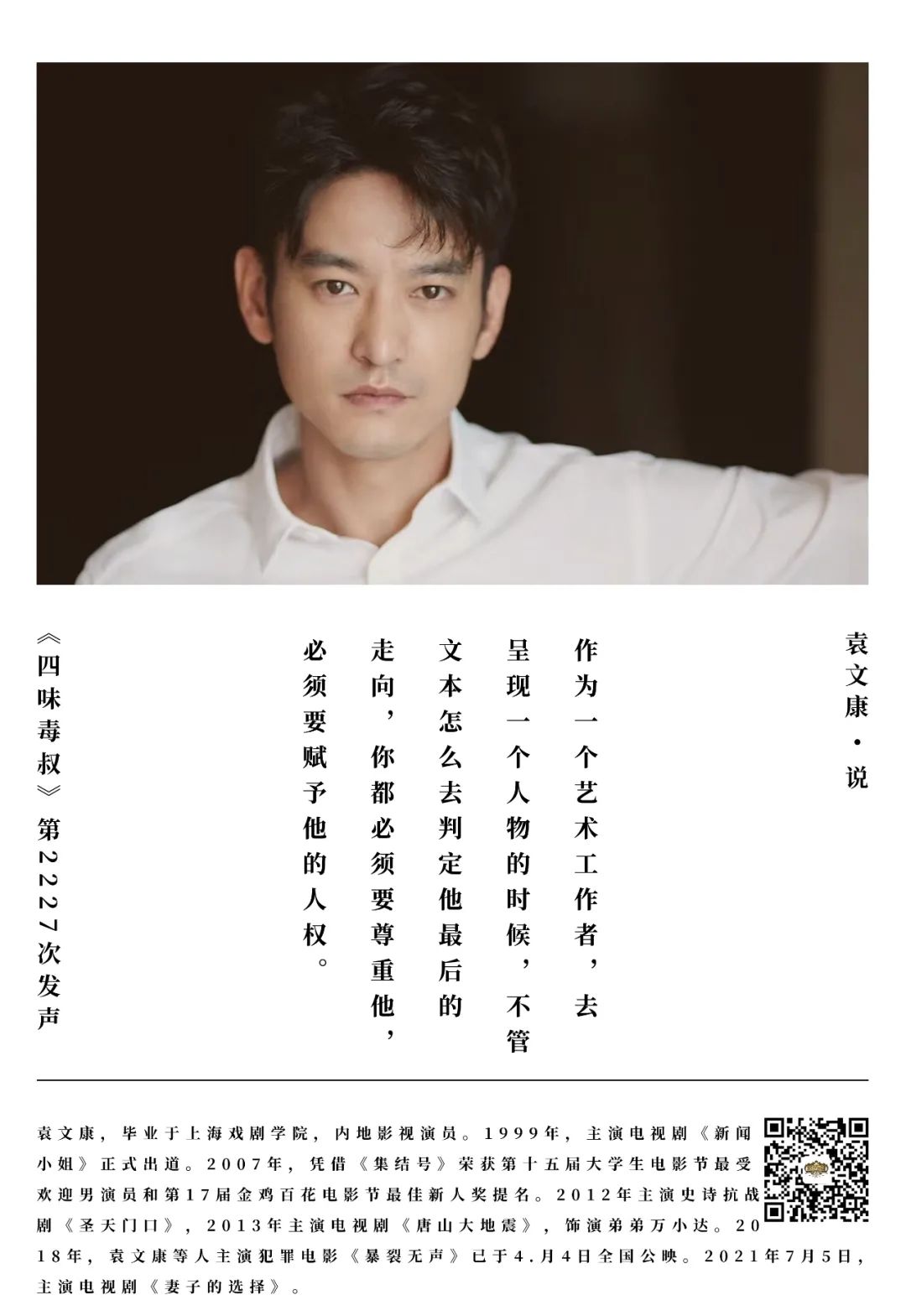 袁文康:我喜欢用这种方式,我觉得作为一个艺术工作者,我们要去呈现一个人物的时候,不管文本怎么去判定他最后的走向,你都必须要尊重他,他也有发声权,就是你在表演的时候,无论从哪个角度入手,你都必须要赋予他的人权,角色也是有人权的。
