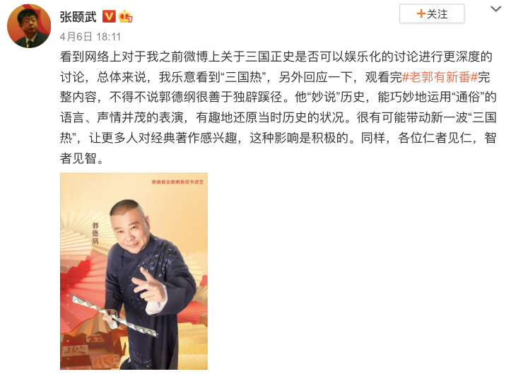 郭德纲,你变了 当红小花 内地男星 2021-04-20 00:03:33 1173 创作不易,用心坚持,欢迎请BaGua喝几杯爱心咖啡!打赏并支持本文 打赏并删除本文 德云社仿佛像住在热搜上一样,尤其是到了卖票的日子。最近两天,德云社封箱演出,只要开票,永远是秒没。一群抢不到票的德云女孩,就会哭上热搜。现在越来越多的年轻人、饭圈女孩喜欢上相声这种传统文化,而这份热潮中离不开德云社偶像化的发展。这两年德云社推出来的相声演员,都成为了流量担当。比如“大小姐”郭麒麟一直在拍戏,最忙的时候将近一年没回家。还有霄字科的秦霄贤,他2019年年底刚刚拜师,短短一年多时间,上了近十档综艺。包括连最早一批拜师的烧饼,都在参加偶像男团类的节目《追光吧哥哥》。虽然这些偶像化的形式,对传统文化来说是不是真的好,存在一些争议。但这些流量和关注,最后也都反哺给了相声行业,从这个角度来说,是对传统相声的发展有帮助的。包括栾云平之前也回应过“相声偶像化”的问题,在他们看来,不管你是谁的粉丝,或者以什么形式的支持,只要花钱来听相声,他们都欢迎。这更像是一种相声适应潮流的趋势,用这个时代特有的传播方式,来发扬传统文化。包括最近郭德纲也新做了一个让人想深入了解三国历史的宝藏综艺《老郭有新番》。这个节目也是这种特点,用新颖的手段,激发观众对历史的兴趣。 《老郭有新番》是优酷全新推出的郭德纲潮派评书的文化类综艺。简单点说是,郭德纲用评书的方式讲三国。能把经典说得通俗易懂,这不是一件容易的事情。在这个节目上,郭德纲为了观众能听得更明白,他融入了很多网络流行梗。像三国中刘备和张飞相遇的时候,郭德纲形容这俩大男人应该属于电影式邂逅,一见钟情,升格放慢拍摄。汉朝有一个官职,名字叫督邮,他的工作职能主要是考察县官的政绩。这个官不算大,但很可怕,如果他回去汇报的时候说几句坏话,那就会很惨。郭德纲用搞笑的流行语形容了一下这个职位的特点,杀伤力不大,但侮辱性极强。他还讲了一个历史人物曹腾,是位“端水大师”,前前后后伺候了四位皇上,“用过的都说好”。他把那些晦涩难懂又繁杂的历史,讲得通俗又吸引人。玩归玩,闹归闹,这个节目的深度并不是开玩笑的。在这些小故事中,有不少让人以史为鉴发人深醒的社会话题。 就说最新一期的节目中,讲了张飞鞭打督邮的前后经过。前面提过,督邮这位考察政绩的小官,到了刘备上班的县城,态度十分傲慢。督邮根本没把刘备放在眼里,说刘备是诈称皇亲,诈冒军功。紧接着,这位督邮找来了刘备的师爷,要求他写出来刘备贪污的金银字画,给刘备安了一个莫须有的罪名。师爷拒不从命,被督邮绑起来暴打。介绍故事前因后果的过程中,郭德纲穿插着科普了一个小知识点,师爷属不属于事业编制。师爷这个职位很特殊,在汉朝时还属于编制内,但到了后期就不在编制内,由县太爷自己给师爷开工资。正直的师爷顶撞督邮遭到了暴打。恰巧这时候暴脾气的张飞路过,实在看不下去,冲了进去替天行道,鞭打督邮。毕竟督邮是朝廷官员,张飞鞭打他之后,刘备也没法混下去了,无奈又气愤之下,只得辞职。归根到底,张飞怒火中烧是替刘备打抱不平,可他却成了刘备辞职的背锅侠。这种因果关系,更映射着职场中的某些现象,或许你在为别人出头,最后你成为矛盾爆发的导火索。双双离开已经是最好的结局,稍不留神自己就是背锅侠。从这里还引出来了一个常被讨论的裸辞梗。裸辞的那一刻可能并非所愿,未来是虎落平阳还是飞黄腾达,皆未可知。未知是一种挑战,也是一种蜕变的可能性。在这个历史小故事中,郭德纲还将许多人生道理和社会话题融入其中。世间之事皆有它的命和运。他以饭论“命运”。桌子上摆了两碗饭,其中一碗被吃掉了,就是它的命;另一碗没有被吃,是它的运。可几天之后,没有被吃的那碗饭,可能变馊了,最终也没逃过被扔掉的命。命运,有时殊途同归。郭德纲还聊到他自己吃饭问题,如果按照他的喜好,一天吃饭10多块钱就够。他就喜欢白菜炖豆腐,冲个鸡蛋汤,再来点大饼面条,他就能吃得就很开心。反而那些金碧辉煌的饭店中的山珍海味,再来一堆陌生人侃大山,他根本不喜欢。大道至简,大简至奢,简简单单才是生活的本质。郭德纲还聊了一个很流行的话题,努力和天赋哪个更重要。从他的人生经验来看,尤其对于从事艺术的学生来说,天赋的意义大于努力,只有拥有天赋的基础,才能让努力发挥出最大的价值。对于艺术工作者来说,天赋可能意味着某种无法言说的感知力。如果一个人拥有天赋,可以优雅的、轻松的打开艺术的大门;没有天赋的人,就需要拼尽全力的推开门。努力是件好事,只是在这个过程中,自己的身体、心理都变得扭曲。没有天赋的人想达到某种高度,其实难上加难。这些包含生活、工作、学习等各个方面的话题,每一个值得大家思考。 郭德纲的这档节目,不光吸引了更多年轻群体对三国历史的喜爱,还引起了历史学家等专业人士的重视。 北大教授张颐武评价《老郭有新番》,能巧妙地运用通俗的语言、声情并茂的表演,让更多人对经典著作感兴趣。其影响力可见一斑。 在节目之外,还有很多三国冷门知识小科普。以前我们受影视剧的影响,很多人都觉得张飞是个五大三粗的糙老爷们,还衍生出了很多网络流行表情包。可