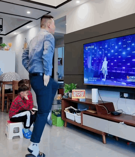 刘畊宏带不动的“中年男孩”,抢过儿子手中的遥控器,跟着她跳起了女团舞,扭起了腰。