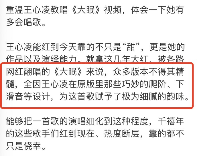 “对比《大眠》不同版本的翻唱,发现王心凌里那些巧妙的爬阶、下滑音等设计,为这首歌赋予了极为细腻的韵味。”