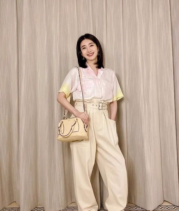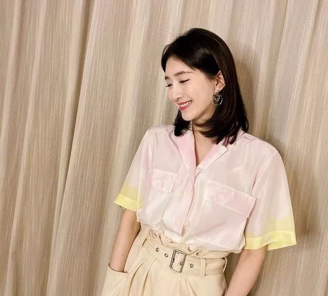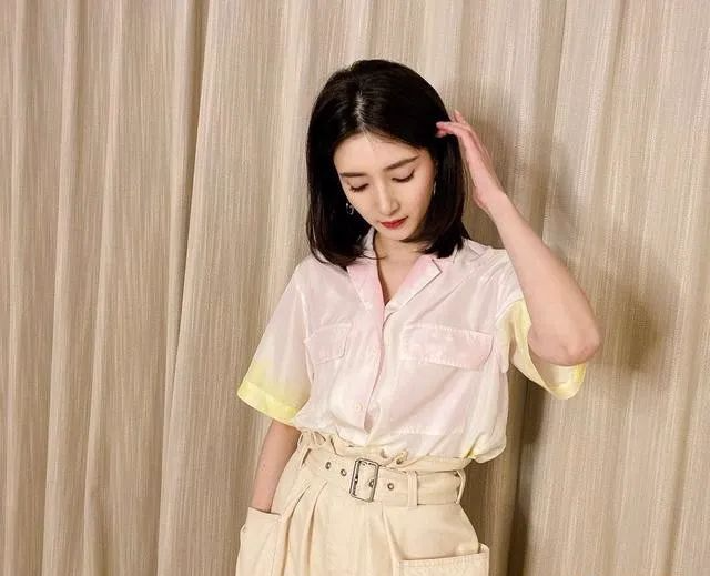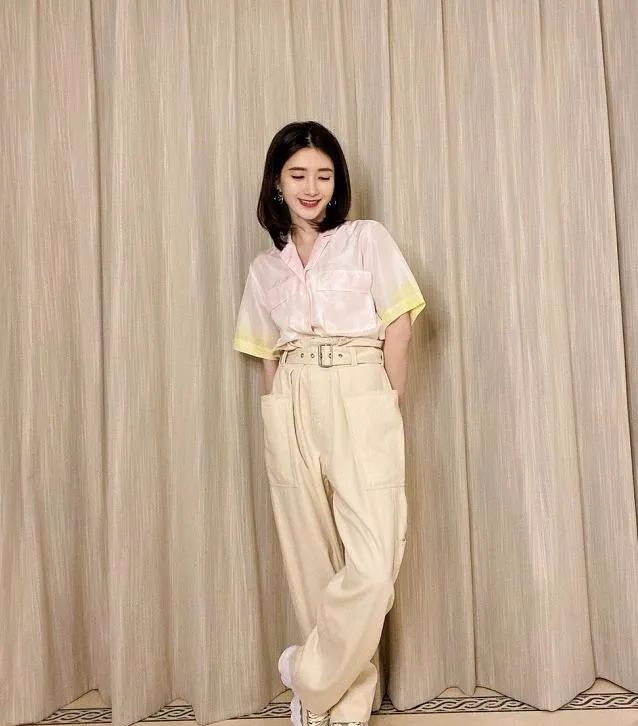 短袖衬衫添加了粉色和浅浅黄色的扎染设计,材质也是很显高级的,看上去有很强烈的光泽感,在平常的搭配上,江疏影穿的最多的就是各种款式的衬衫,穿着衬衫的她往往要比穿着普通T恤更加有气质,不同颜色进行扎染设计的衬衫,同样也是很浅的颜色,很吻合江疏影的气质。