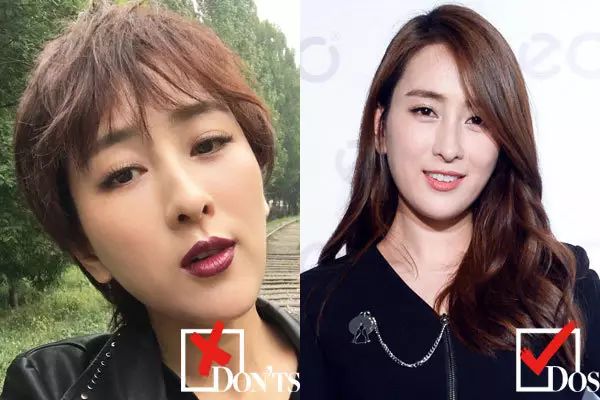 黄金定律说她不适合短发不无道理,瞧,将头发剪短到鬓角位置后(左图),原本就呈竖鹅蛋的脸型,被显衬得更长了。而拉抻发丝的长度后(右图),脸型的视觉重心有效提升,长长脸得到有效缓解。